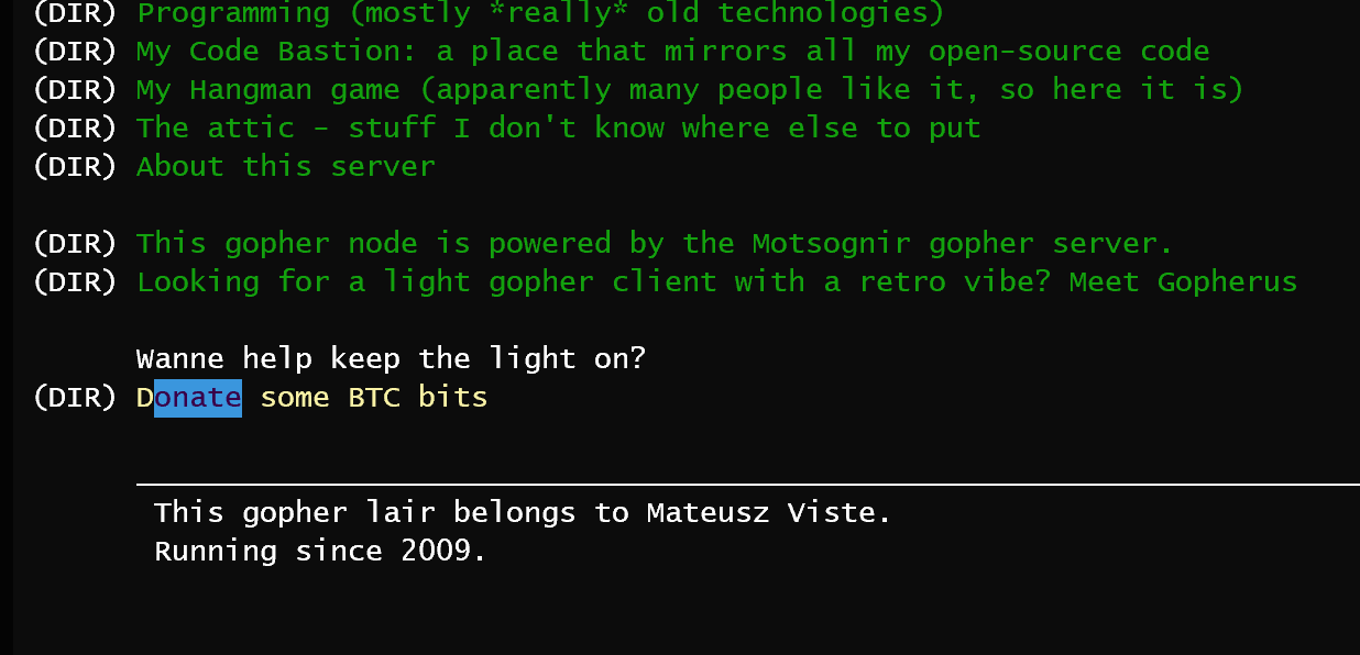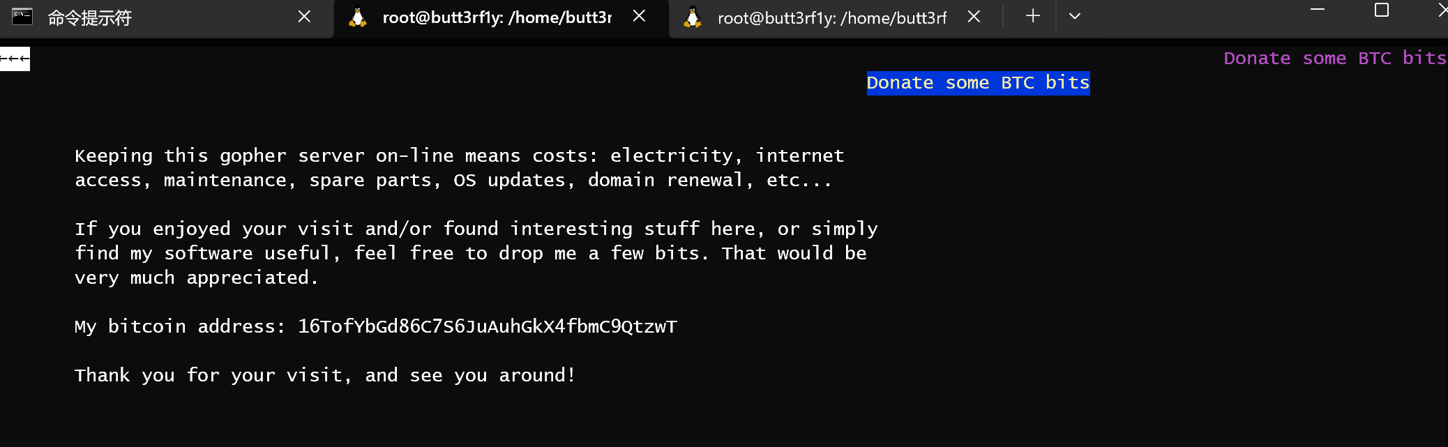 查找捐赠地址,这里有一个 gopherspace node,访问