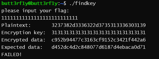 val = inv_sbox_table[out_val ^ k_byte] ^ mix_val if prev_key_byte is None: prev_key_byte = val elif prev_key_byte != val: consistent = False break if consistent: cands.append(k_byte) if len(cands) == 1: final_key_array[p] = cands[0] else: print(f"Error at byte {p}: found {len(cands)} candidates") sys.exit(1)